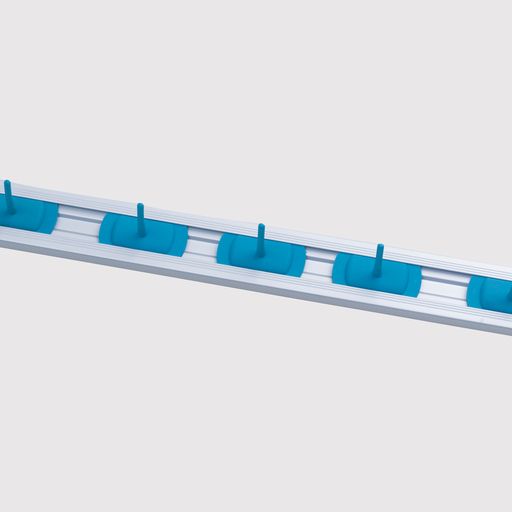 Wall bracket system, 515mm aluminium rail with 5 hooks (HDHOOK1) & coloured ends. Suitable for hanging brooms, brushes, scoops and dustpans. Durable and easy to clean Colour coded for HACCP compliance